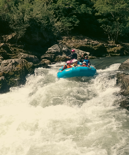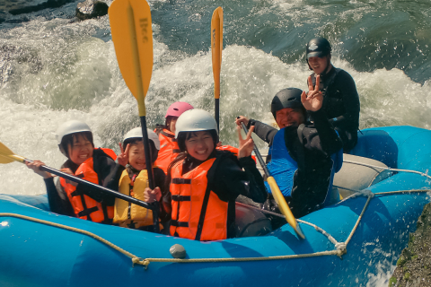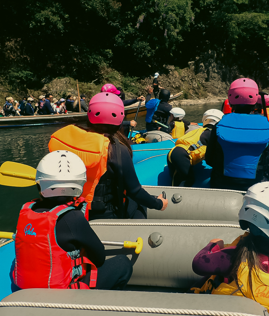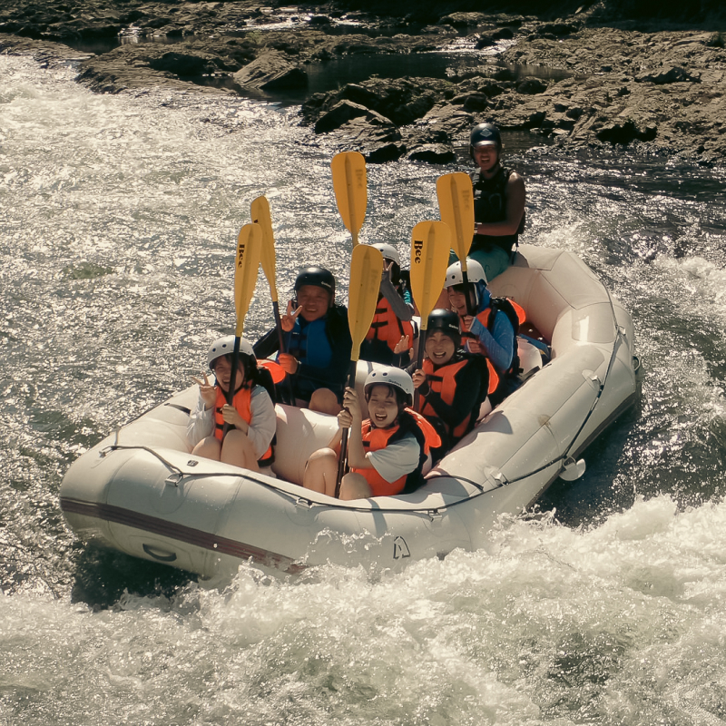 いよいよボートで激流へ!みんなでスリル満点の波を乗り越えます。みんなで力を合わせて漕ぐ一体感はたまりません!