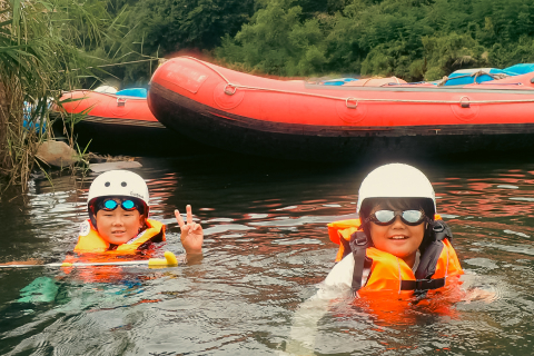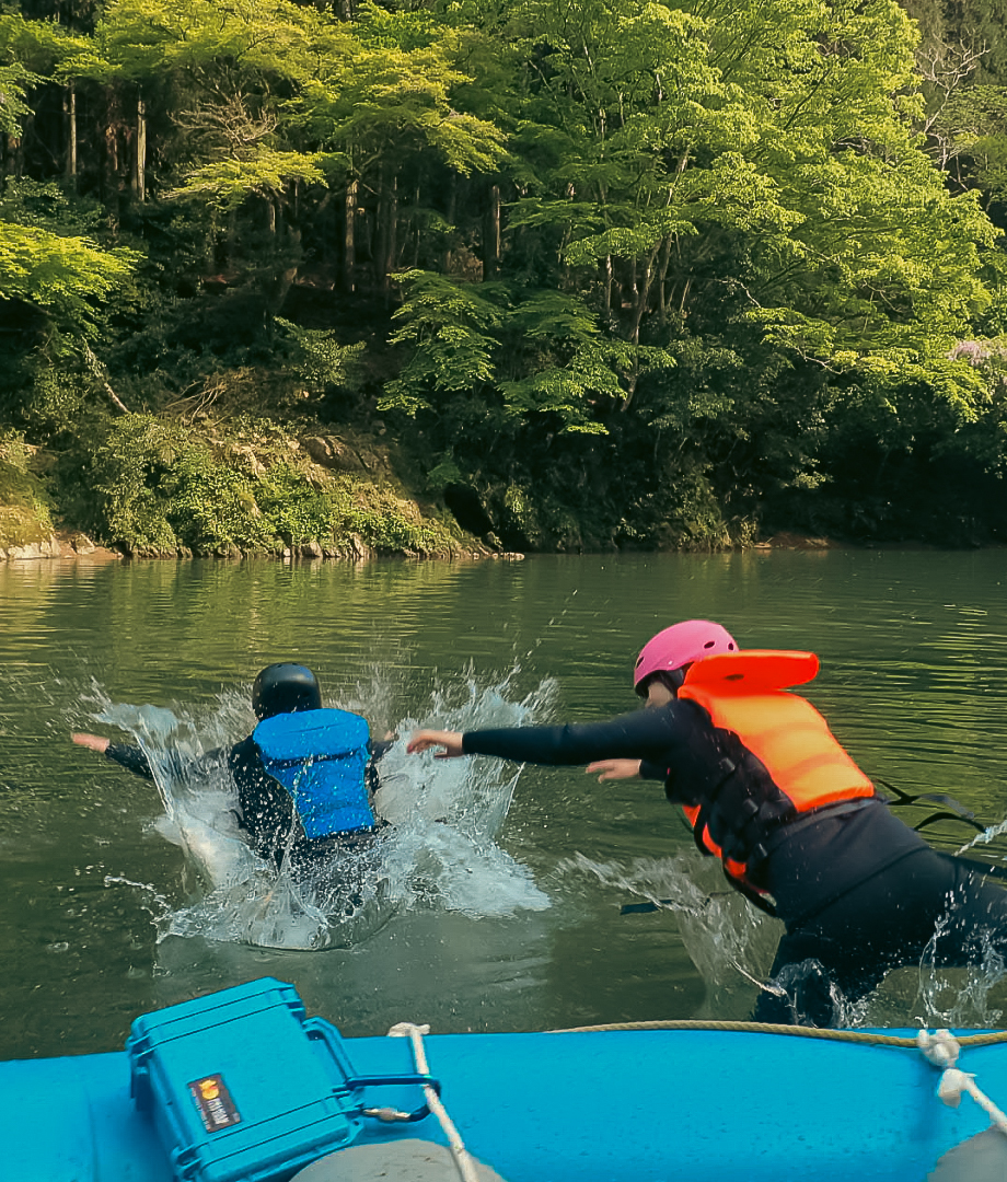 激流を下るだけじゃもったいない!流れの穏やかなポイントでは、ボートを降りて自由な遊び時間がスタート。 「次はこれやりたい!」が叶うのは、少人数制のFReXだからこそ。子供も大人も時間を忘れて、保津川の大自然と一体になれる、笑顔弾ける最高のひとときです。